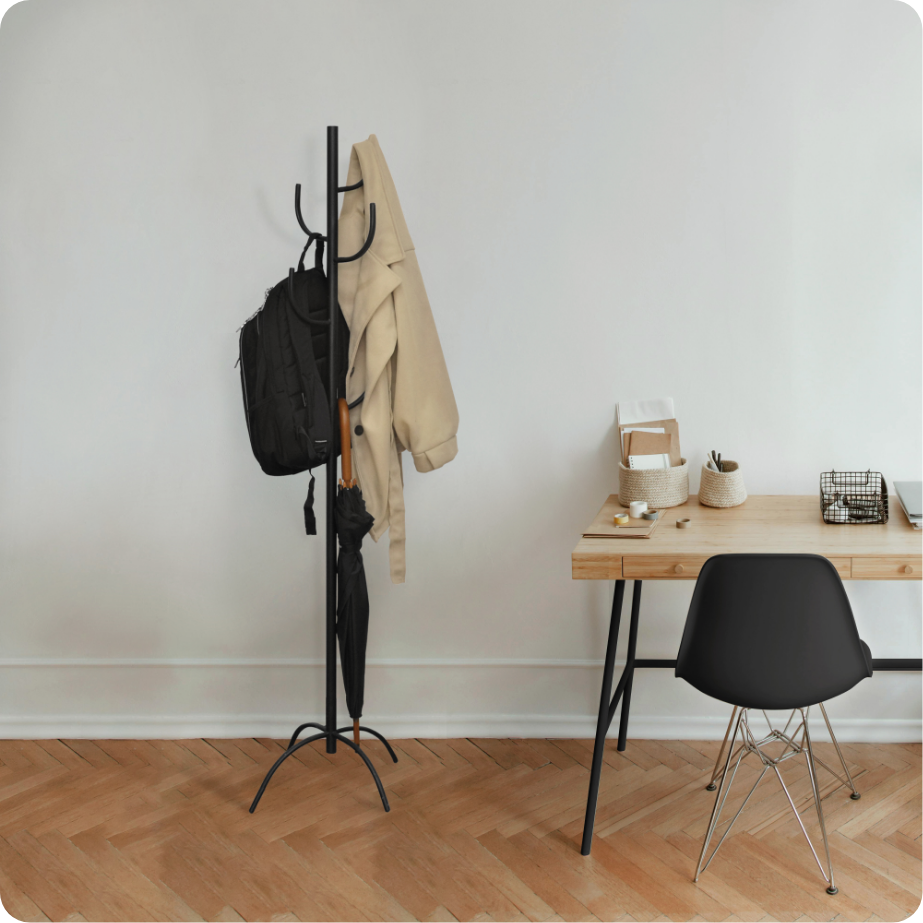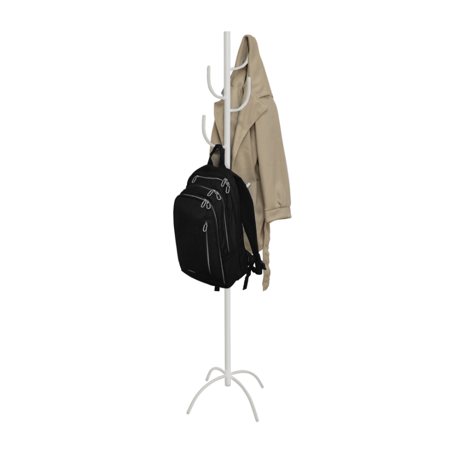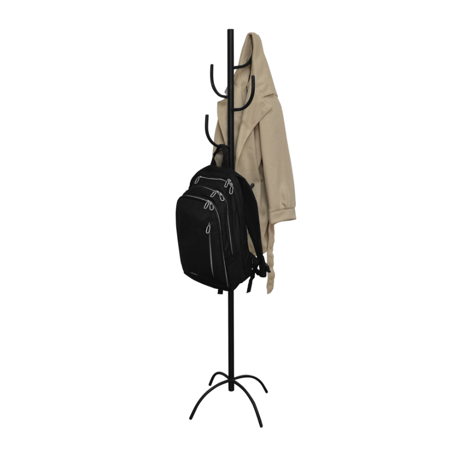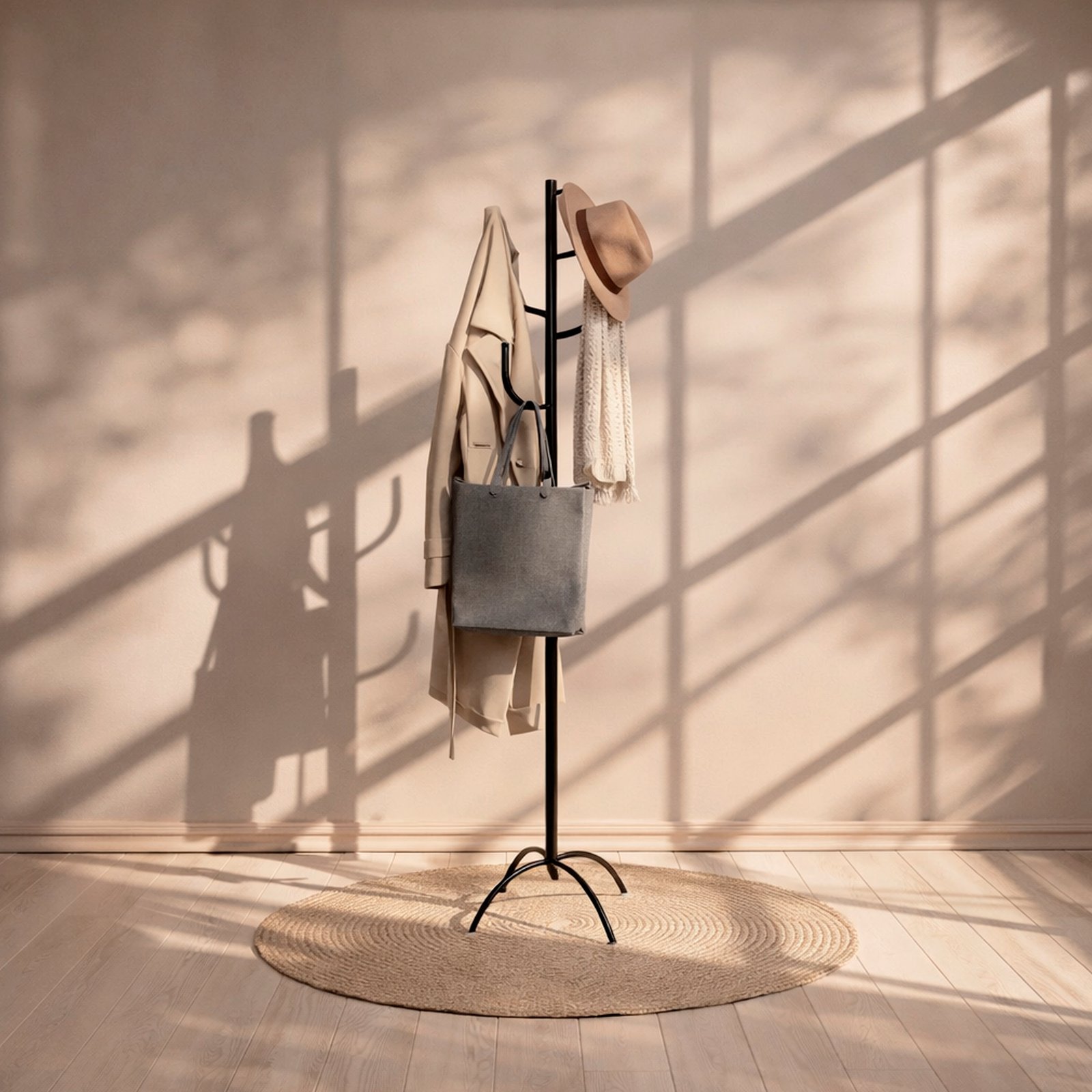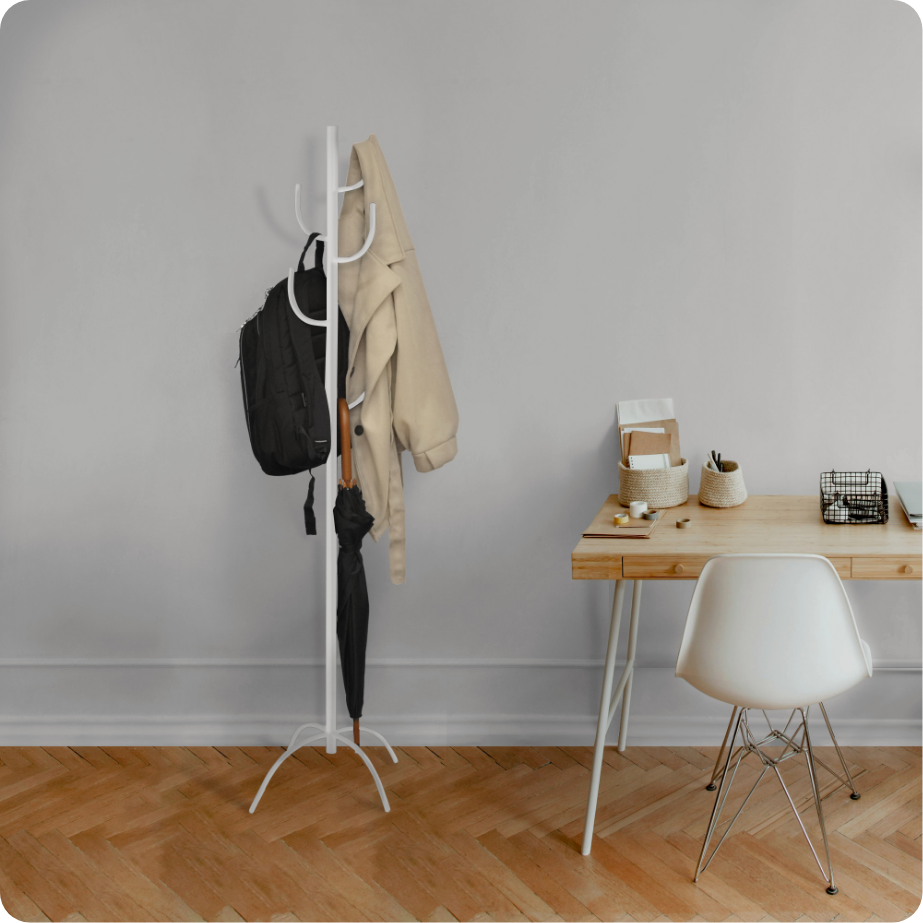 Perchero moderno y funcional con 5 perchas estratégicamente distribuidas. Soporta hasta 18 kg. Fácil de armar.