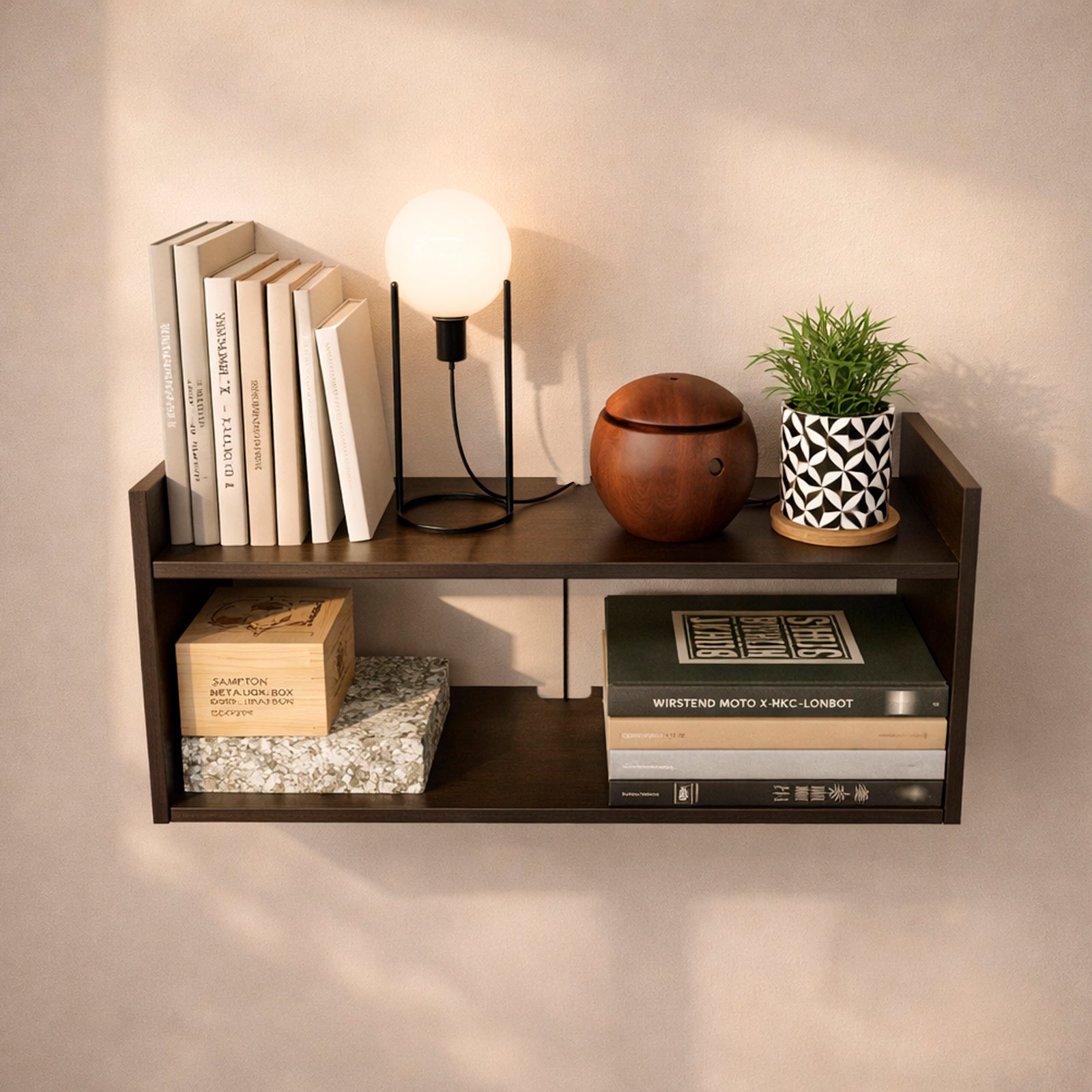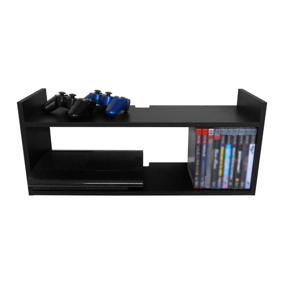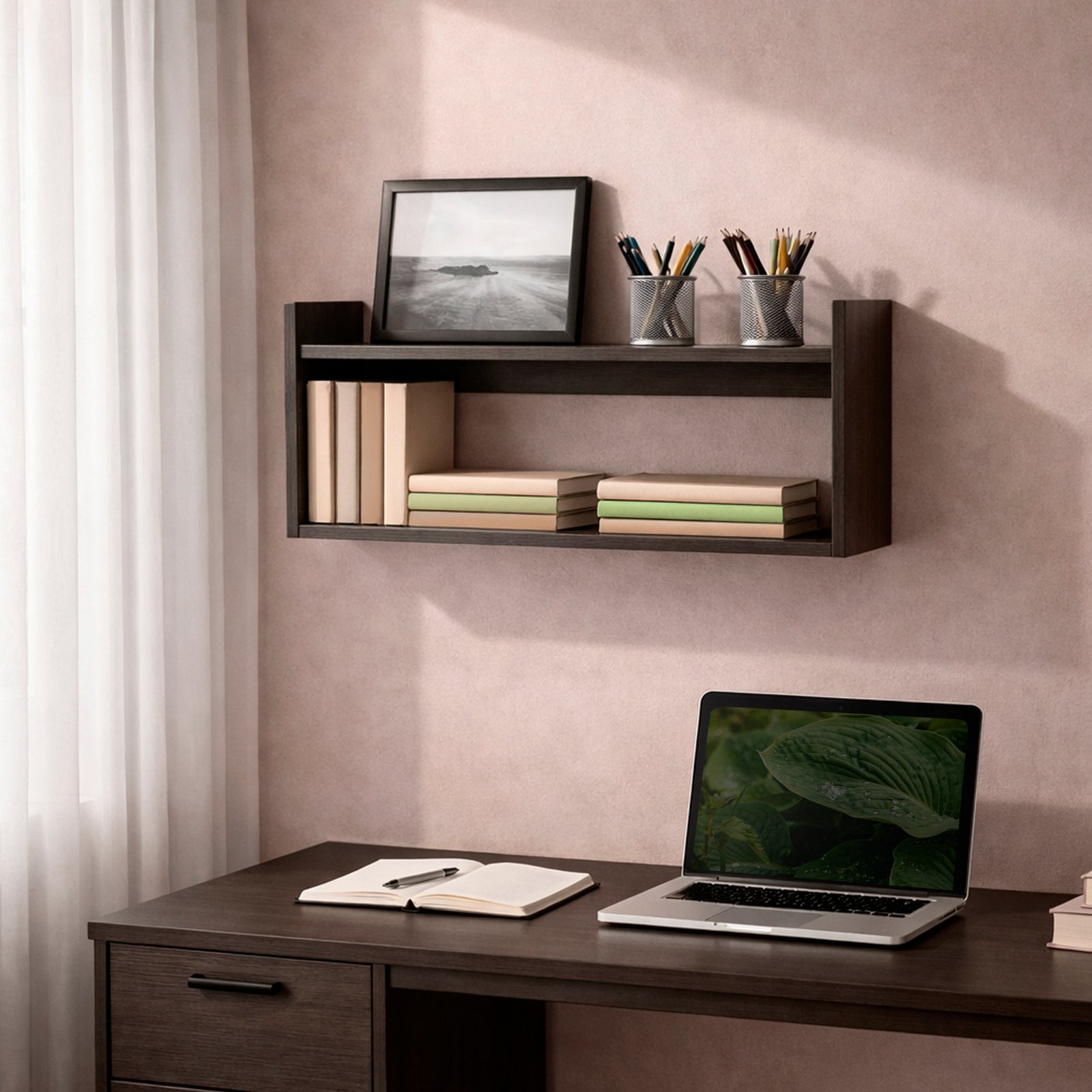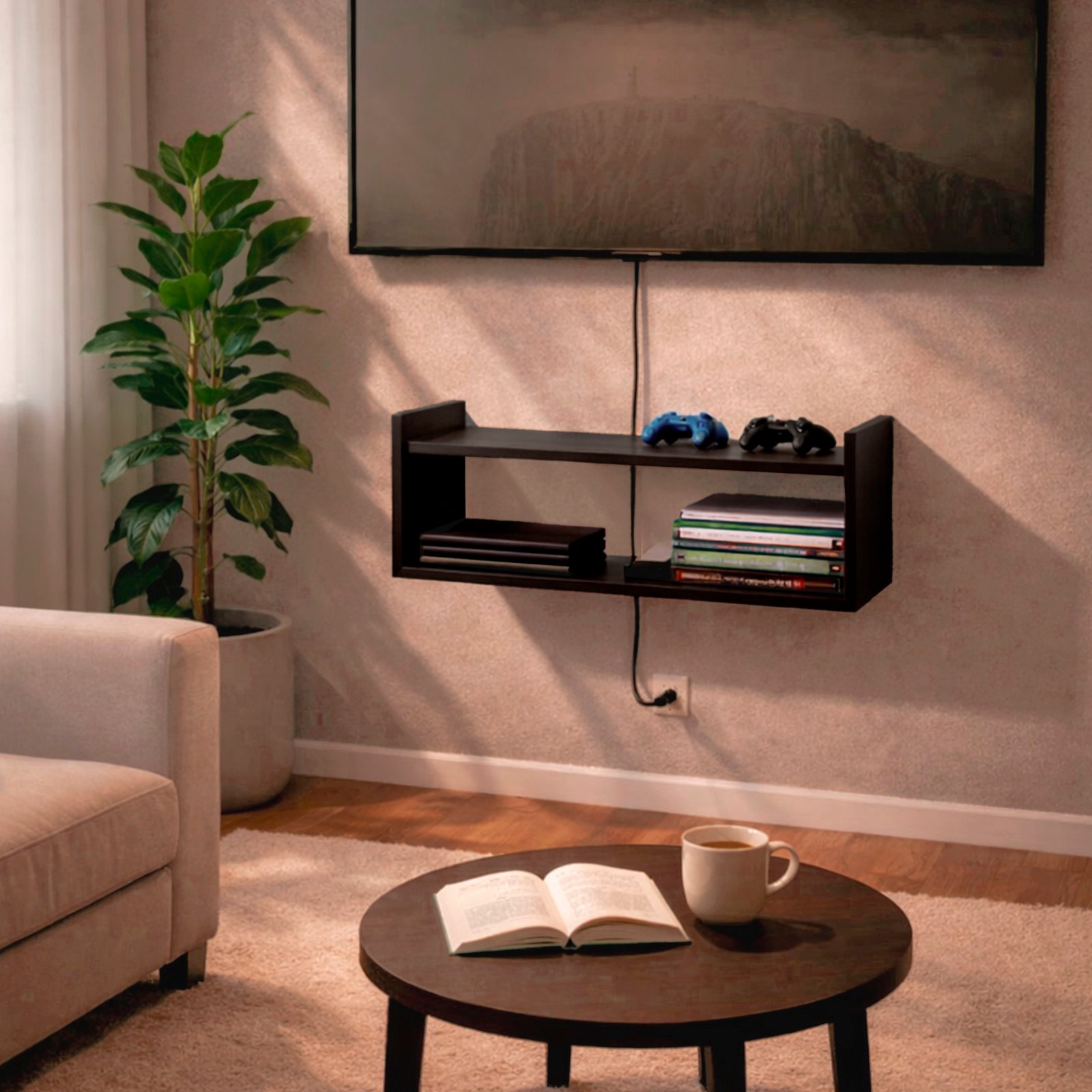 Repisa ideal para centros de entretenimiento en color wengue. Soporta hasta 15 kg.